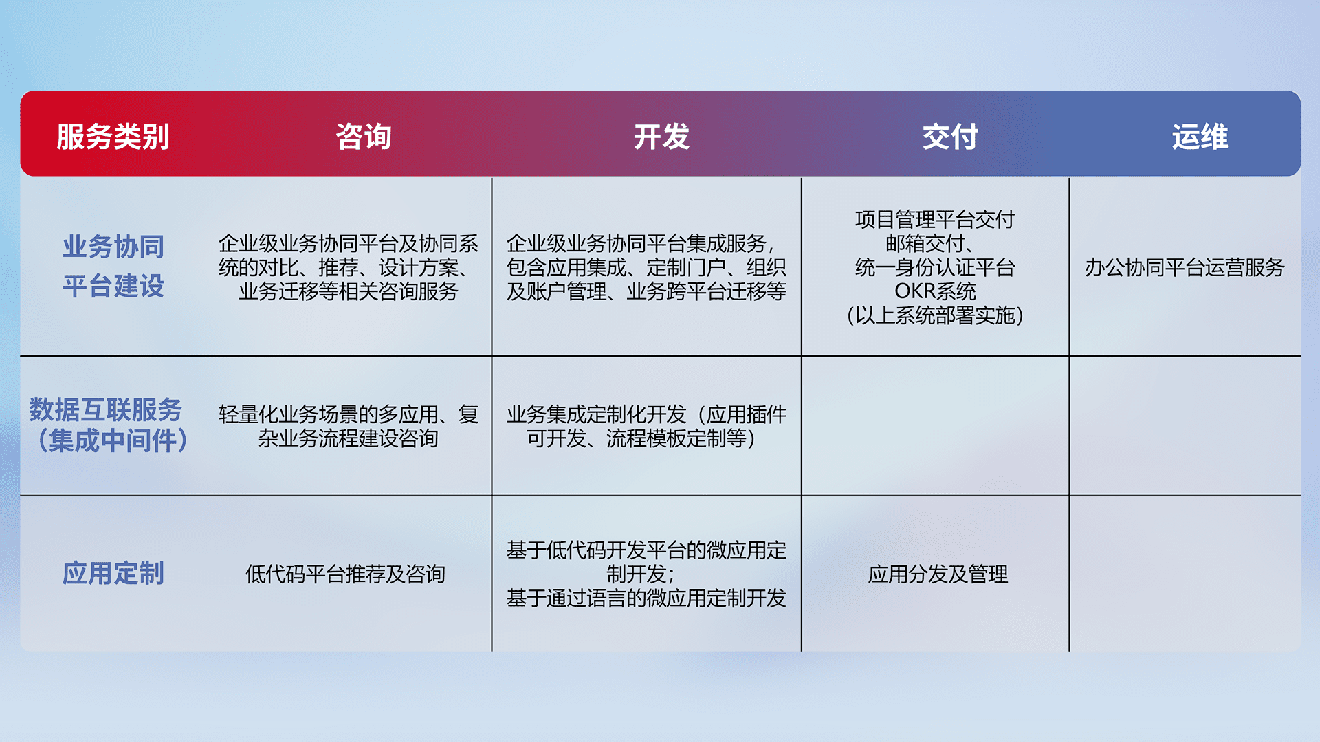 针对钉钉、、、企微、、、、IDaas等平台级产品提供产品的规划、、方案、、、、交付、、定制化开发等服务,,,,实现如统一协同办公、、、、智能客户服务、、、、混合会议管理、、、智能数据查询、、、、等业务场景,,,,实现数字化转型。。