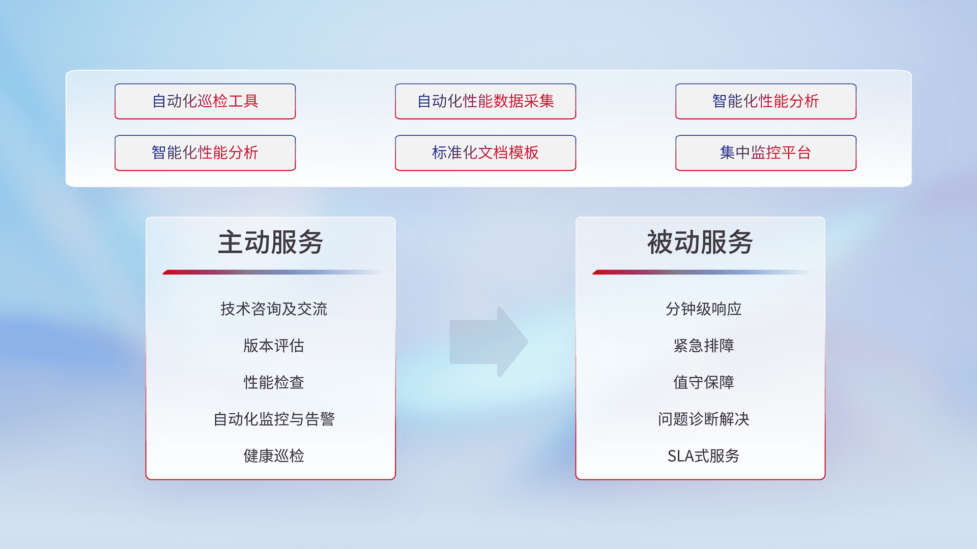 智能化工具和标准化文档,,保障服务质量,,,提供主动服务(包含技术咨询、、、版本评估、、性能检查、、、自动化监控与告警、、健康巡检)和被动服务包含(分钟级响应、、、紧急排障、、、值守保障、、问题诊断解决、、、SLA服务)。。。。